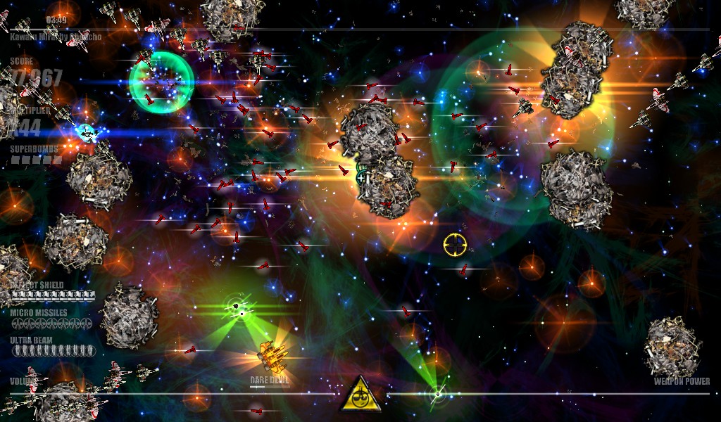 Beat Hazard is a top-down twin-stick shooter where you pilot a spaceship powered by music. In this game, your ship's fire rate, the spawn rate of enemies, and the intensity at which they attack you is based on the track that's currently playing. So what happens when, mid-song, the music gets really quiet for a brief period? Your guns shut off and the enemies grind to a halt. It's very jarring, and puts the player in a state of near-helplessness as they wait for the song to pick back up. In games like these, the player is beholden to the music rather than working with it. Due to the more difficult nature of these games and the skills they reinforce (memorization and repetition), we tend to see these types of rhythm games come out of Eastern developers.